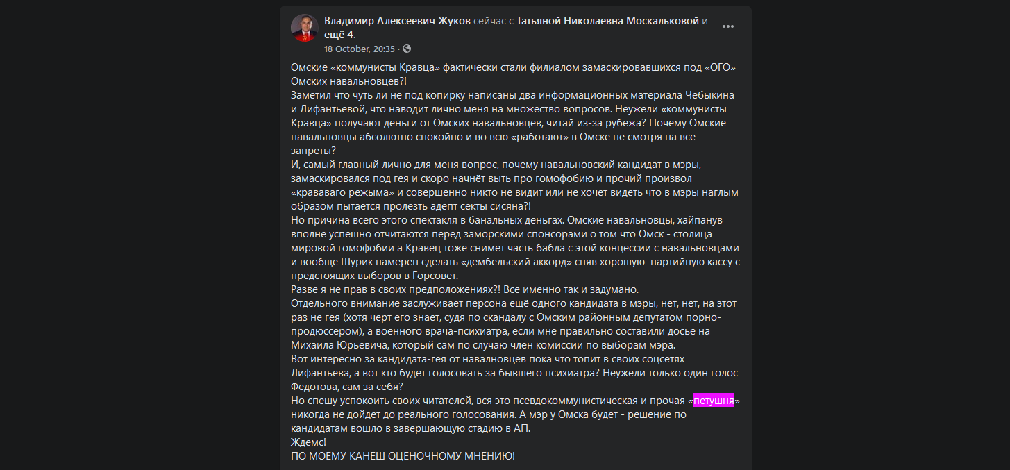 Добавим, что сам Жуков тоже не отличается тактичностью. На прошлой неделе он опубликовал пост в Facebook, где использовал сниженную лексику и называет «петушнёй» некоторых кандидатов на пост мэра.