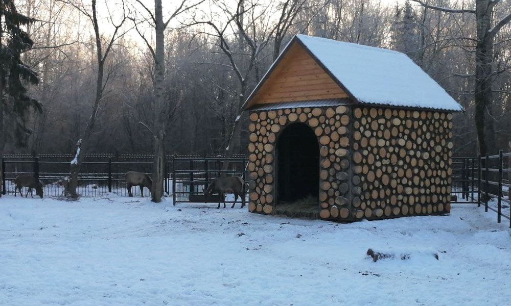 Для оленей закончили расширять вольер, построили уютный домик, сделали удобную кормушку. Благоустроенные апартаменты находятся рядом с вольером зубров, который открыли в августе — на день рождения зоопарка.