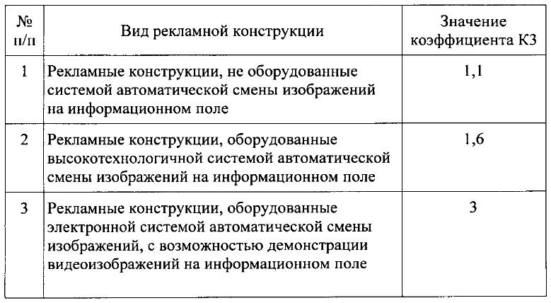 Кроме того, пересмотрены типы рекламных конструкций и по-новому распределены коэффициенты. Этот пункт вступит в силу с 1 января 2022 года.