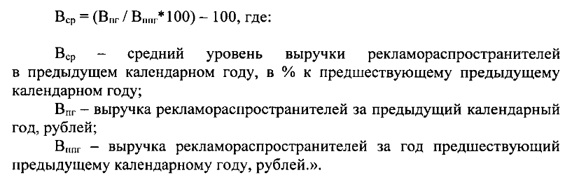 Согласно решению депутатов, при снижении выручки рекламораспространителей в предыдущем календарном году (иначе говоря, в 2020-м) относительно выручки годом ранее (то есть относительно уровня выручки в 2019-м) расчёт размера оплаты за текущий календарный год снижается на процент снижения выручки. Предел льготы — 20%, а снижение выручки компании должна заверить налоговая служба. Процент снижения будет рассчитываться по определённой формуле (фото ниже).