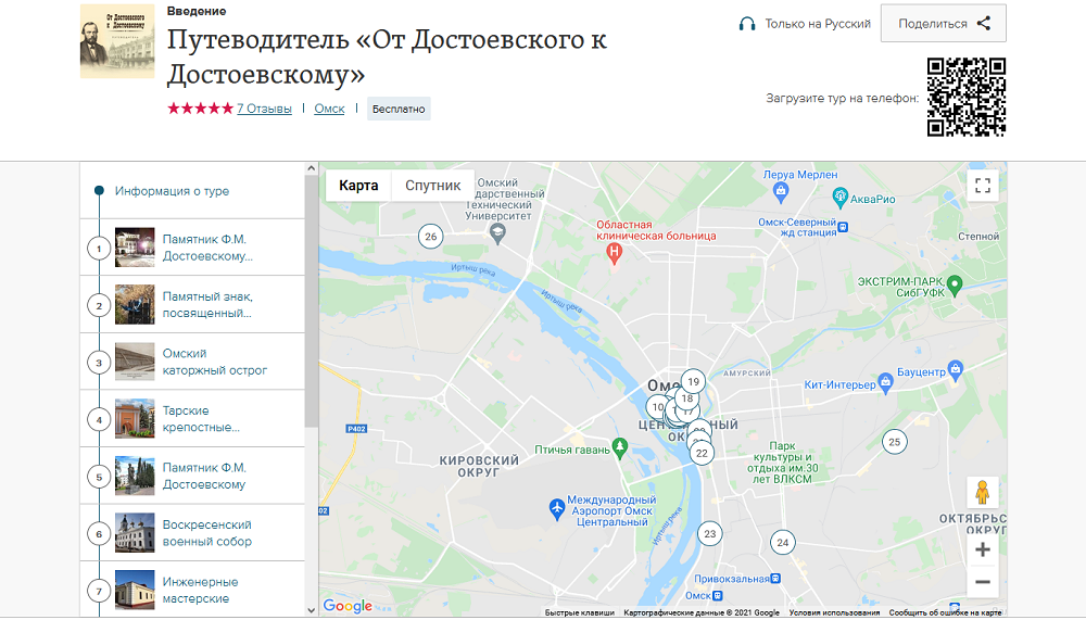 Путеводитель «От Достоевского к Достоевскому» омичам презентовали в марте этого года в честь 200-летнего юбилея писателя. Пройти по маршруту, объединяющему 25 локаций, можно при помощи электронного экскурсовода. Путеводитель размещён на платформе izi.travel. Подготовили его специалисты «Омских муниципальных библиотек». Маршрут начинается от памятника писателю, который стоит возле академического театра драмы. Он объединяет Тарские ворота, Воскресенский собор, берег Иртыша, бывший дом коменданта Омской крепости и другие места.