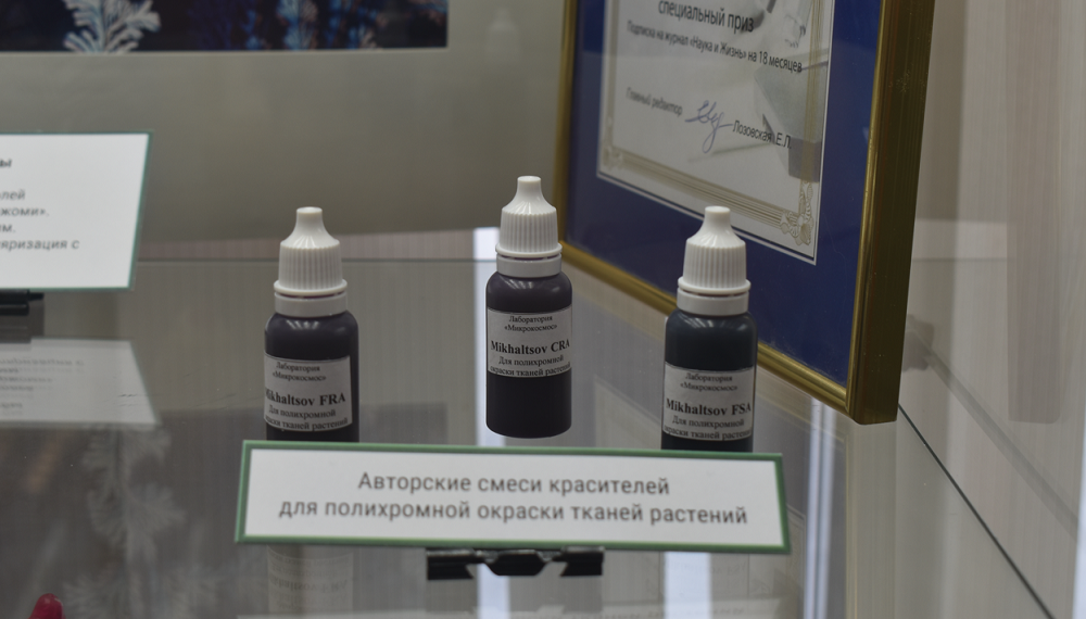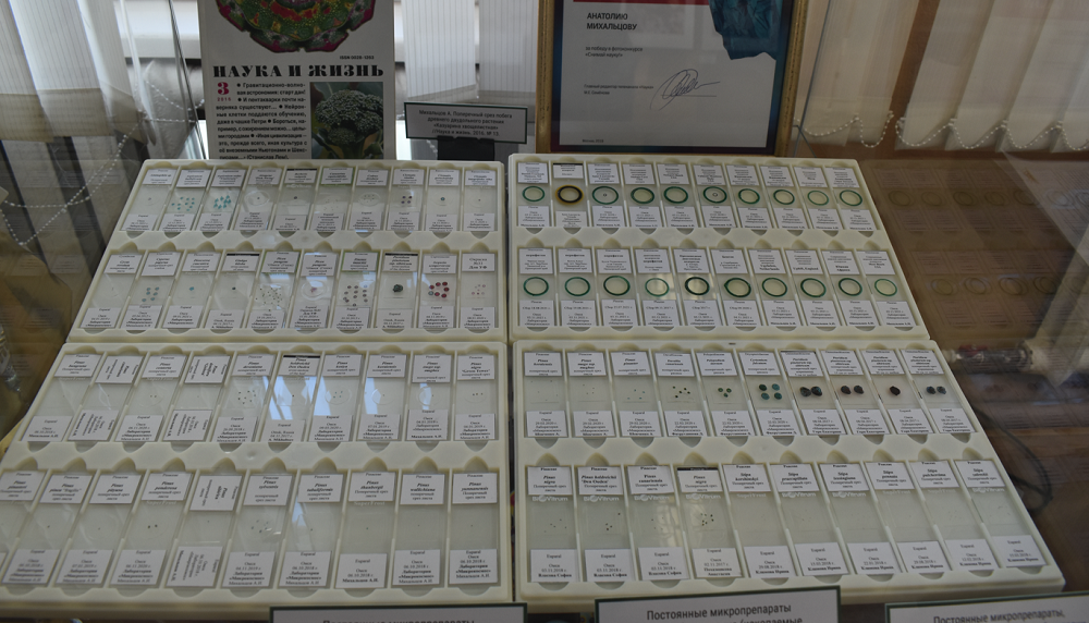 «Анатолий Михальцов лауреат государственной V Всероссийской премии «За верность науке», в 2019 году его признали лучшим популяризатором науки среди педагогов нашей страны. Интересно, что он ещё и создал свои авторские красители для образцов. Те, что существовали ранее, были вредными для здоровья, плохо влияли на лёгкие. А его красители безопасны настолько, что с ними могут работать дети», — рассказала куратор выставки Ольга Карлова.