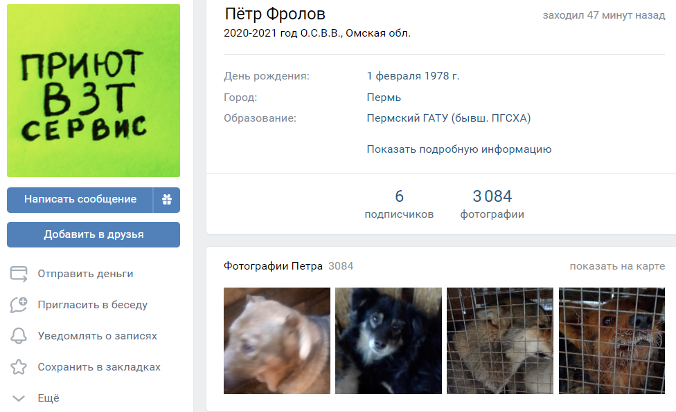 И ещё один интересный момент. В предыдущем материале 12 канал рассказывал, что в официальном паблике «ВЗТ-Сервис» в соцсети «ВКонтакте» нет информации об отловленных собаках. Как выяснилось, есть. Правда, опубликованы фотографии не на странице сообщества, а на личной странице некоего Петра Фролова из Перми.