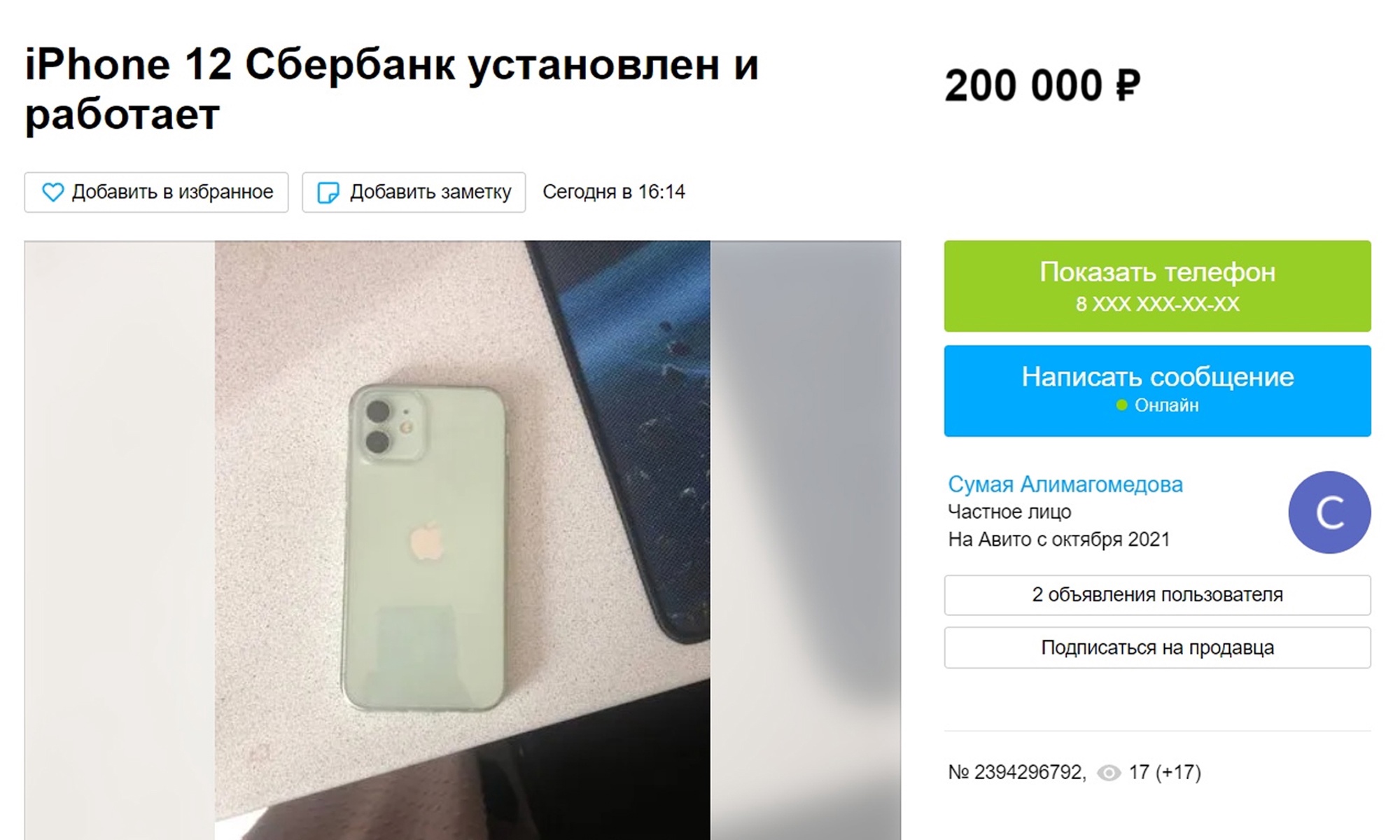 Или, к примеру, объявление с iPhone 13, который в магазине будет стоить около 170 тысяч. Однако на сайте бесплатных объявлений его предлагают купить за 250 тысяч. Высокая цена в этом случае, как и в предыдущем, объясняется наличием установленного приложения Сбербанка.