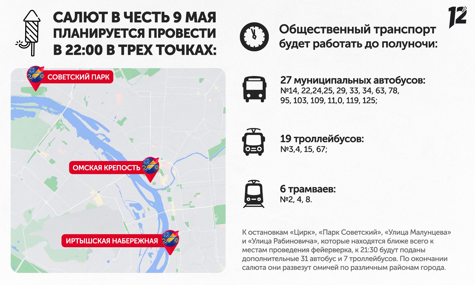 Запускать праздничные залпы будут из трёх точек, ставших уже традиционными: у берега Омской крепости на набережной Тухачевского, у Советского парка на улице Андрианова и в районе гостиницы «Амакс», которая находится на пересечении Иртышской набережной и бульвара Победы.