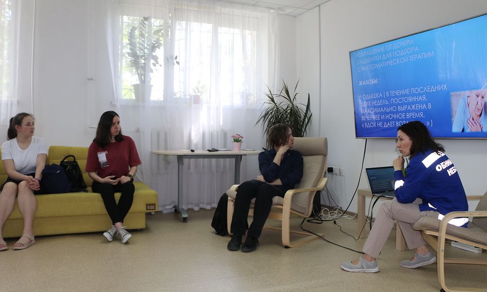 Вместе с выездной бригадой девушки поехали затем с визитом к больным: попробовали себя в уходе, лечении пролежней современными средствами. Студенты узнали, как бороться с болью и симптомами у онкологических пациентов, понаблюдали за общением специалистов с членами семей.
