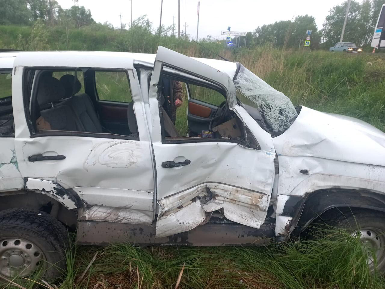 Затем Niva врезалась в погрузчик-экскаватор, который был на перекрёстке, уступая дорогу машинам. После чего легковой автомобиль оказался в кювете.