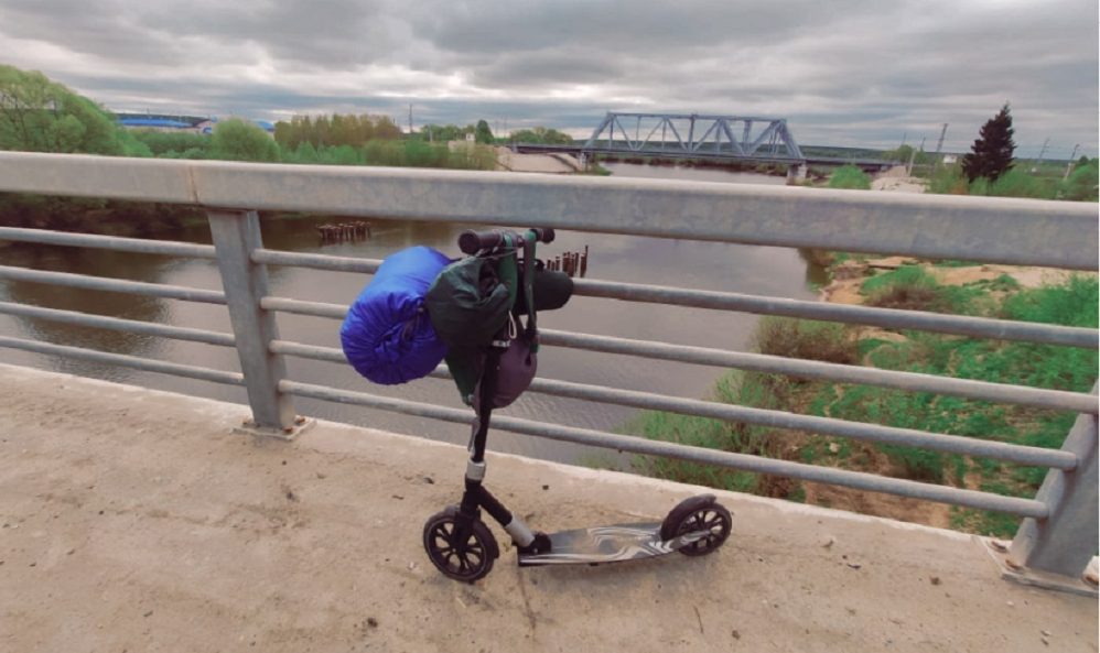 Денис Бритвин настолько любит кататься на самокате, что отправился на нём в полугодовое путешествие. Причём самокат он использует самый обычный, не электрический. Палатку и другие вещи, которых совсем немного, он везёт, повесив на руль.
