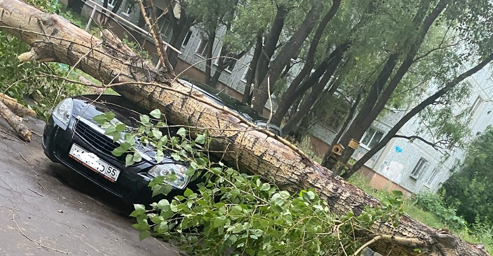 На Иртышской набережной упало большое дерево, сообщили в паблике «ЧП Омск» соцсети «ВКонтакте». Автомобилистам приходится объезжать преграду, так как лежит тополь прямо на проезжей части. Также подписчики паблика прислали фото из Нефтяников, где тополь упал, придавив машину.