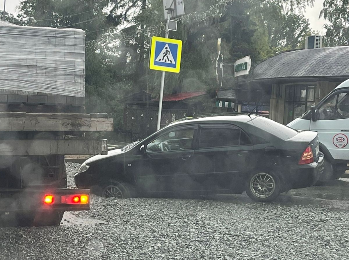 На Партизанской сегодня машина на полколеса провалилась в землю. Возможно, это случилось потому, что дождь подмыл почву на ремонтируемой дороге.