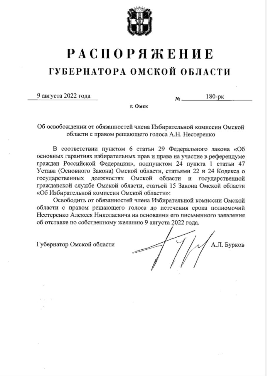 «Освободить от обязанностей члена избирательной комиссии Омской области с правом решающего голоса до истечения срока полномочий Нестеренко Алексея Николаевича на основании его письменного заявления об отставке по собственному желанию 9 августа 2022 года», — сказано в документе.