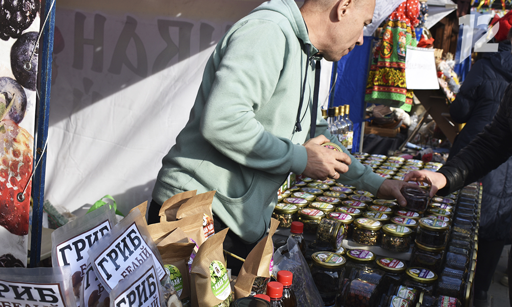 На ярмарке работает 90 торговых точек. От посетителей отбоя нет. Кто-то примеряет варежки, кто-то пробует плов, а кто-то смотрит концерт фольклорных коллективов — задорные народные песни, гармошка и балалайка поднимают настроение.
