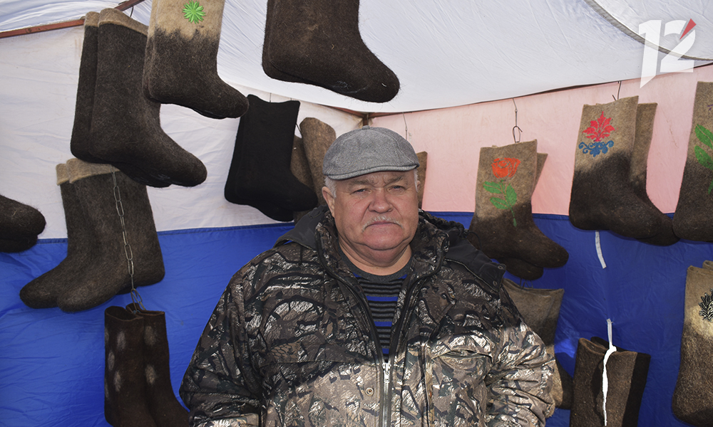 А здесь гости из Горьковского Павел и Татьяна Ягофаровы представляют продукцию семейного мини-цеха. Это валенки и тапочки ручной работы.