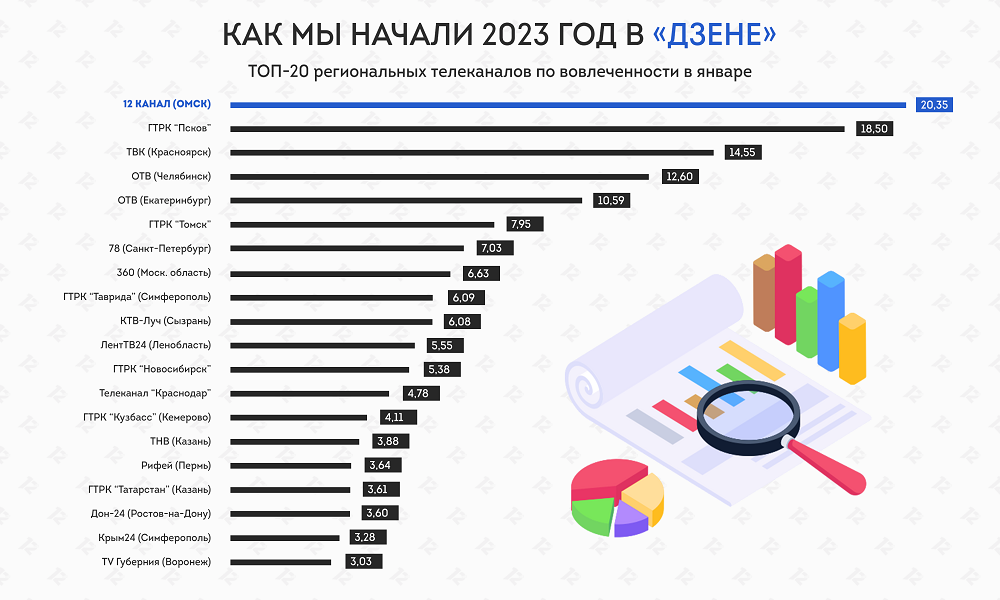 Среди сообществ «ВКонтакте» с количеством подписчиков более 30 тысяч мы находимся на первом месте по итогам февраля. Такой показатель, как отметили эксперты национальной академии телевидения, большая редкость для средств массовой информации. Также мы занимаем второе место среди телеграмм-каналов по количеству подписчиков и вовлечённости аудитории. А по результатам января за нами также лидерство в «Дзене». Процент активной аудитории нашего канала превысил 20%.