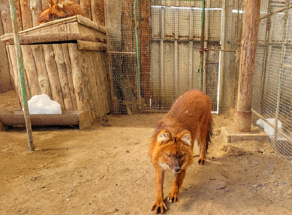 А вот красный волк, или красный дьявол. Эти животные считаются кровожадными охотниками, но интересно, что к добыче они первыми подпускают детёнышей.