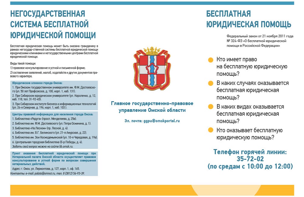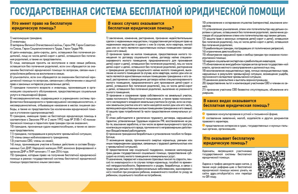 Чтобы проинформировать омичей, правительство региона составило специальный буклет, в котором рассказано, кто имеет право на бесплатную юридическую помощь, в каких случаях она оказывается, каких видов и кем.