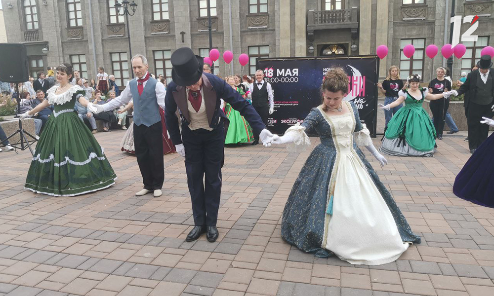 Сегодня, 18 мая, в Омске проходит «Ночь музеев» (0+). Для гостей подготовили экскурсии, мастер-классы, перформансы, квесты. Тема акции в этом году: «Сказки на ночь». На открытии на улице Музейной выступили артисты студии исторического танца «Виджи». Они исполнили классический вальс в бальных костюмах.