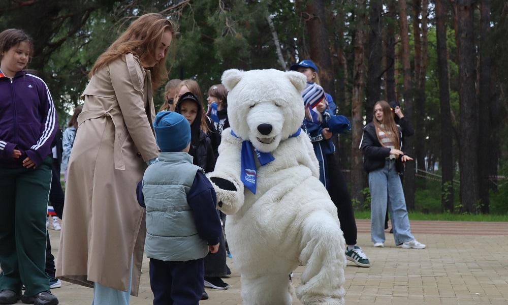 Особенно сильно детей заинтересовал партийных мишка. Он развеселил зрителей зажигательным танцем, а также с удовольствием фотографировался.