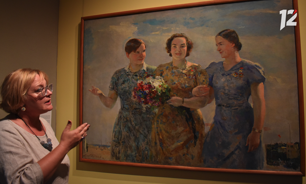 А эта работа прибыла из Пермской государственной художественной галереи. Здесь изображены знаменитые лётчицы Валентина Гризодубова, Полина Осипенко и Марина Раскова. У каждой на платье — звезда Героя Советского Союза.