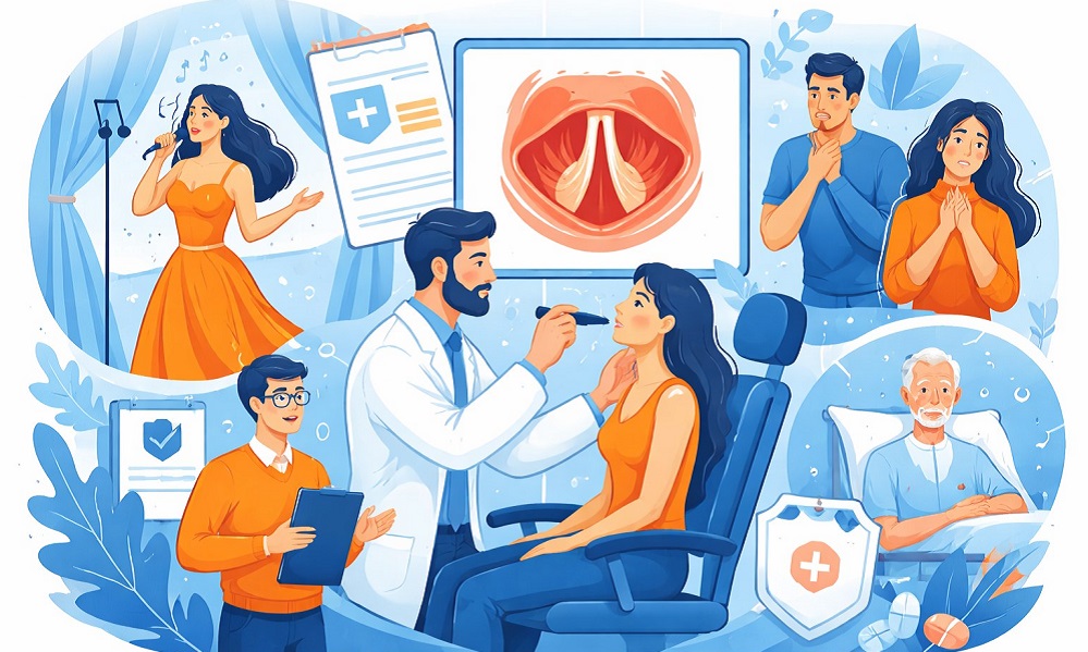 К этому специалисту обращаются при нарушениях голоса, длительной охриплости, осиплости или потере голоса (афонии), при функциональных дисфониях, заболеваниях голосового аппарата, повреждениях (узелках, полипах, кистах, папилломах), параличе или парезах голосовых связок.