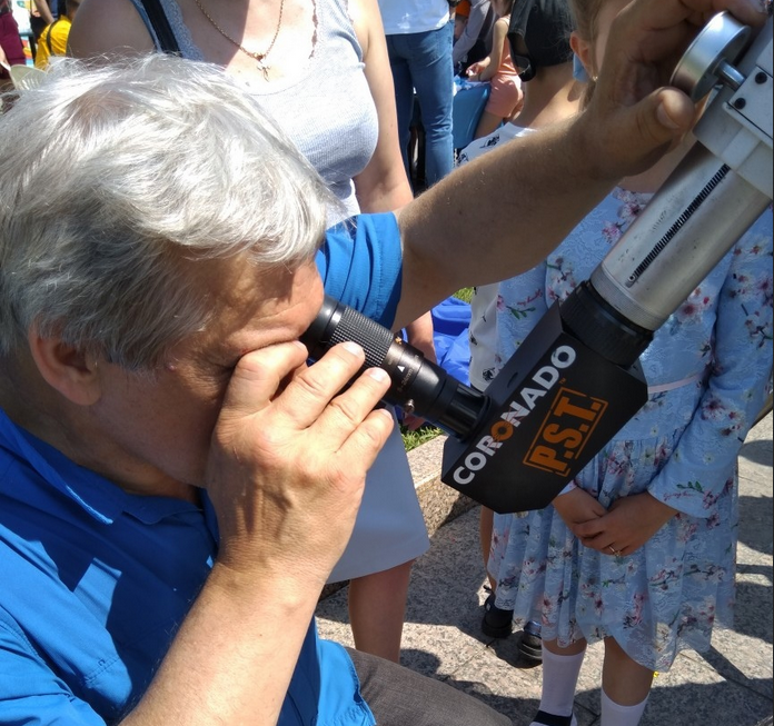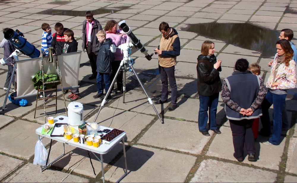На площадке будут установлены телескопы со специальными защитными фильтрами, будет особый солнечный телескоп Coronadо и проекционный телескоп. Можно посмотреть на удивительное явление и самостоятельно, но помните об осторожности. Тёмные очки не дают достаточной защиты глазам. Можно воспользоваться стеклом для маски сварщика (лучше, если оно будет не фиолетовым, а коричневым, тогда солнце будет видно чётче), дискетой или специальным фильтром, но его нужно заранее приобрести в отделе астрономической оптики.