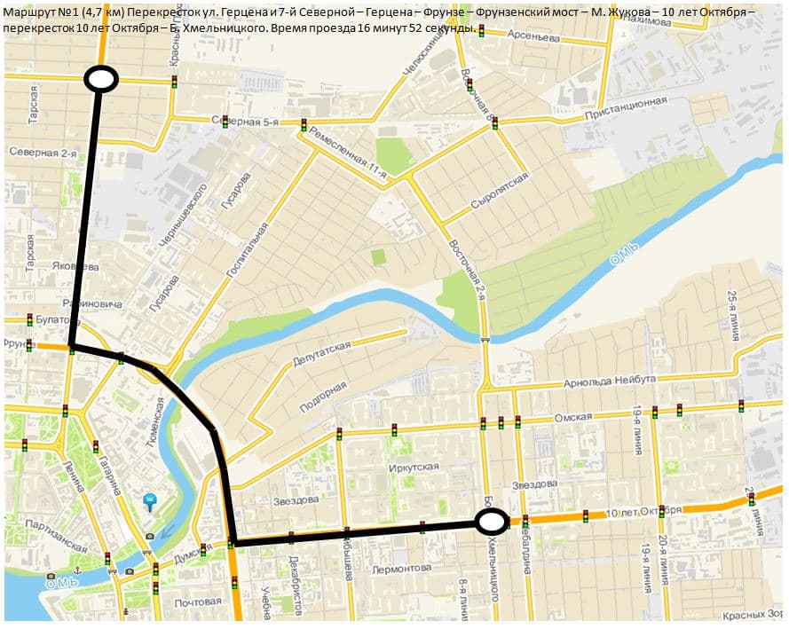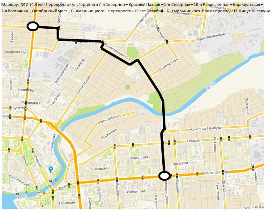 Начало маршрута — пересечение улиц Герцена и 7-й Северной, заканчивается проезд на перекрёстке 10 лет Октября и Богдана Хмельницкого. Хронометраж проводили утром, когда загруженность дорог на максимальном уровне.
