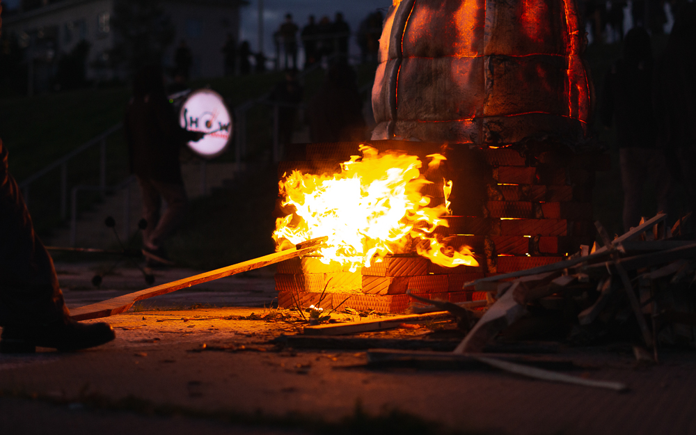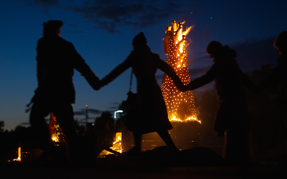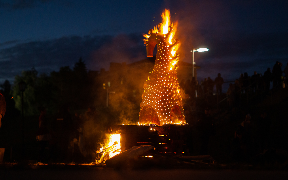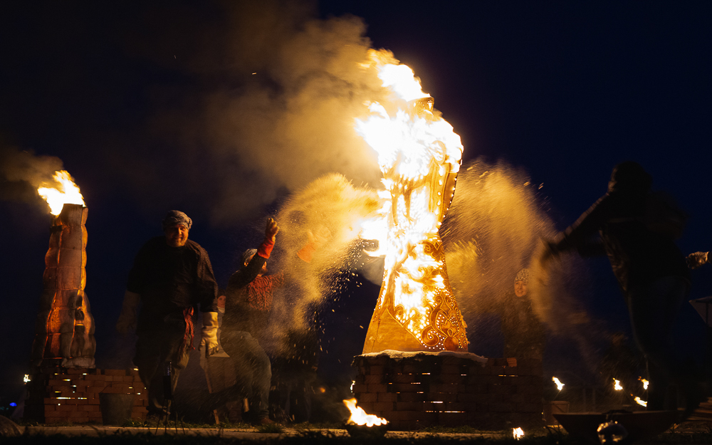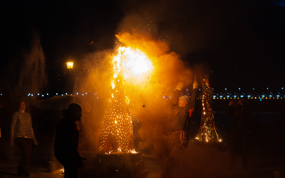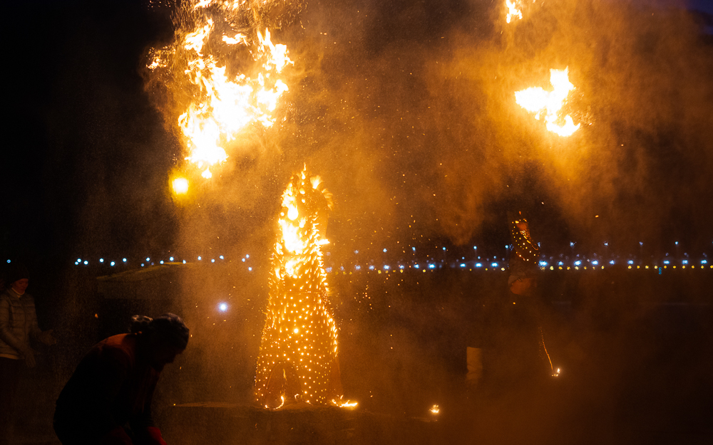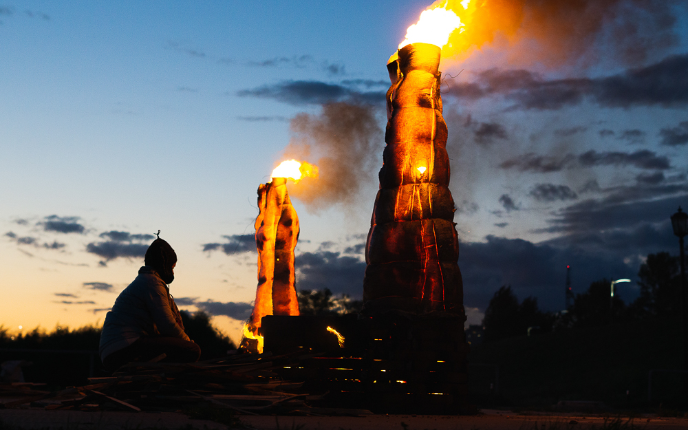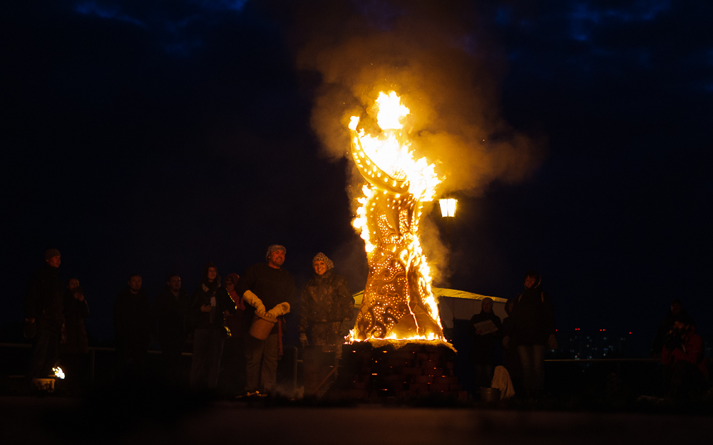 Для этого на смотровой площадке соорудили печки, сверху установили скульптуры, укутали их в специальное термостойкое одеяло и загодя начали топить до самого вечера. В ожидании нужного момента гостям предложили другие огненные во всех смыслах зрелища под звуки барабанов и атмосферные этнические мотивы.