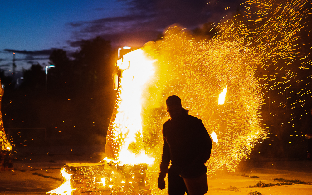 А вот её коллега Андрей Задерий сделал уже не меньше 15 таких работ. Впрочем, признался он, для него скульптура живёт всего 20 минут, пока горит, поскольку она всего лишь каркас для огня. На этот раз его работа — конь-огонь, и в этом лаконичном названии всё сказано.