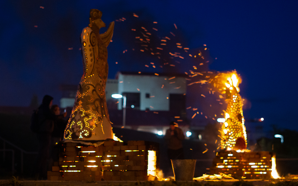 Целых 10 дней в детской художественной школе № 3 кипела работа — керамисты готовили две двухметровые глиняные скульптуры. Точнее, даже не в школе, а на улице — там оформили «мастерскую», где авторам помогали выпускники и ученики. Сколько было потрачено на это самой глины, не могут ответить даже создатели. Но уверены, что точно больше 150 кг для каждой. А всё для того, чтобы устроить феерический перфоманс и обжечь изваяния на глазах у десятков омичей.