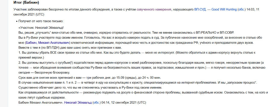 «Я решил, что всё же не буду подавать на Николая Эйхвальда в суд, я даже готов извиниться, что грозил судом, но в ответ он и его друзья-«эксперты» должны извиниться перед всем сообществом Википедии за низкий уровень своей «экспертизы», — говорит Михаил Бабкин.