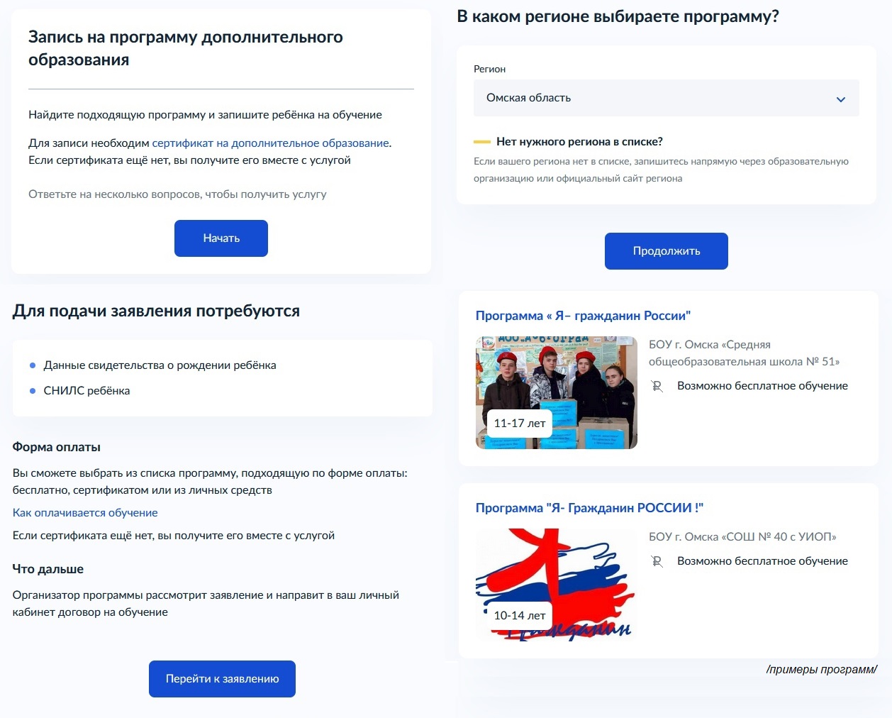 В личных кабинетах жителей Омского региона сервис уже доступен. В нём больше сотни спортивных, художественных школ и других учреждений не только города, но и районов области. Запись на дополнительные занятия в них была возможна и раньше, напрямую, теперь — через «Госуслуги». Для подачи заявления на понравившуюся программу необходимы данные свидетельства о рождении ребёнка и его СНИЛС. Организатор программы рассмотрит заявку и направит в личный кабинет родителя договор на обучение, уточняется на портале госуслуг.