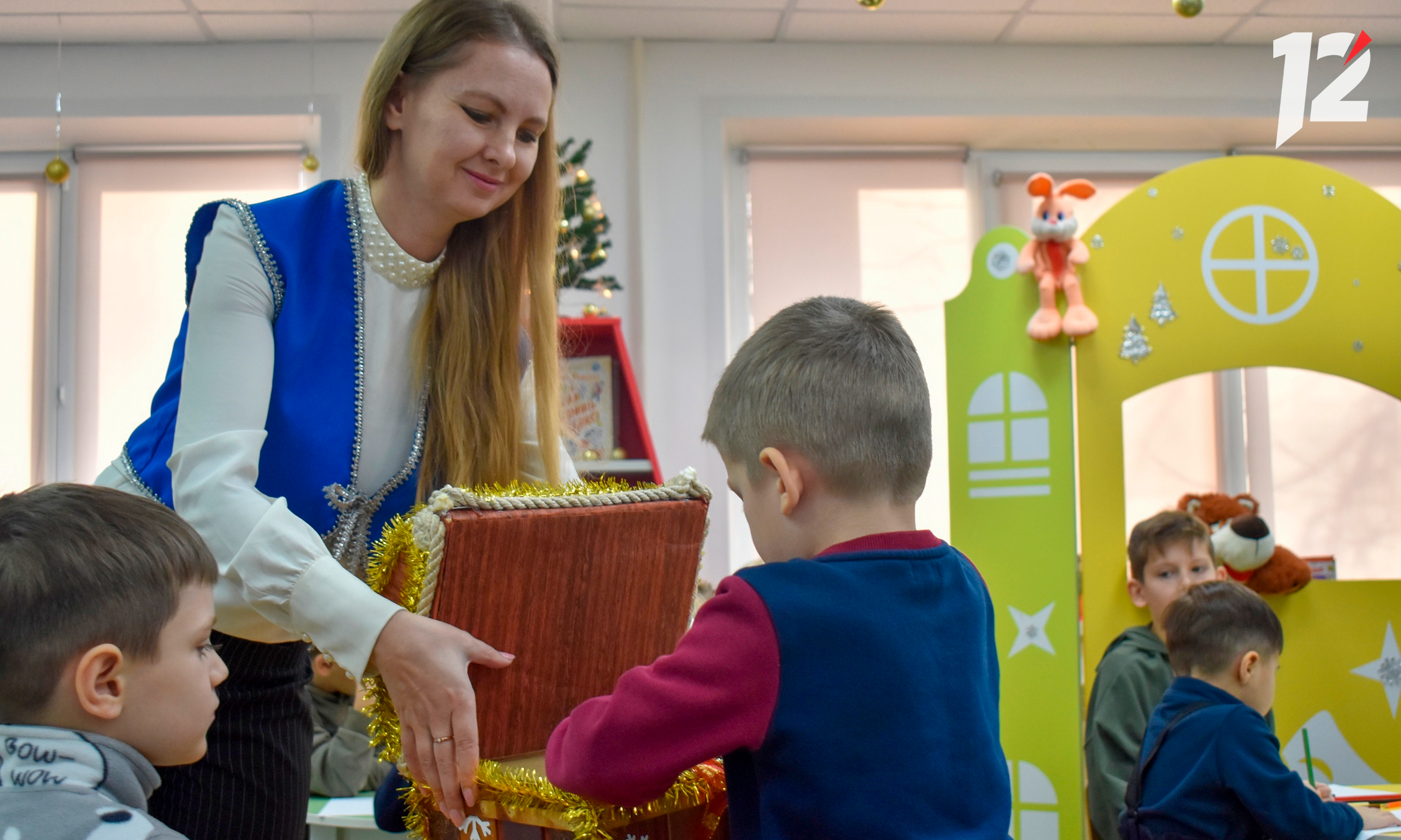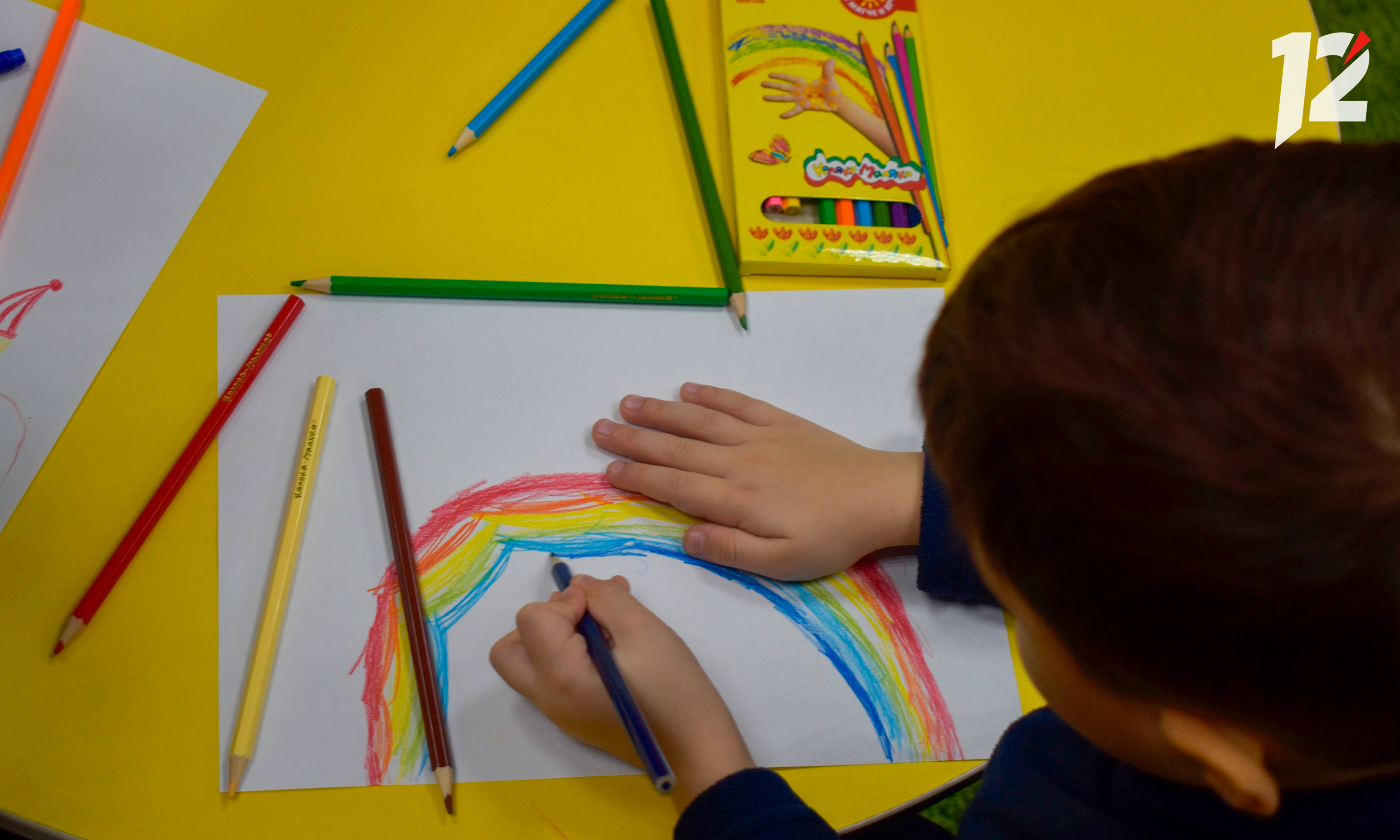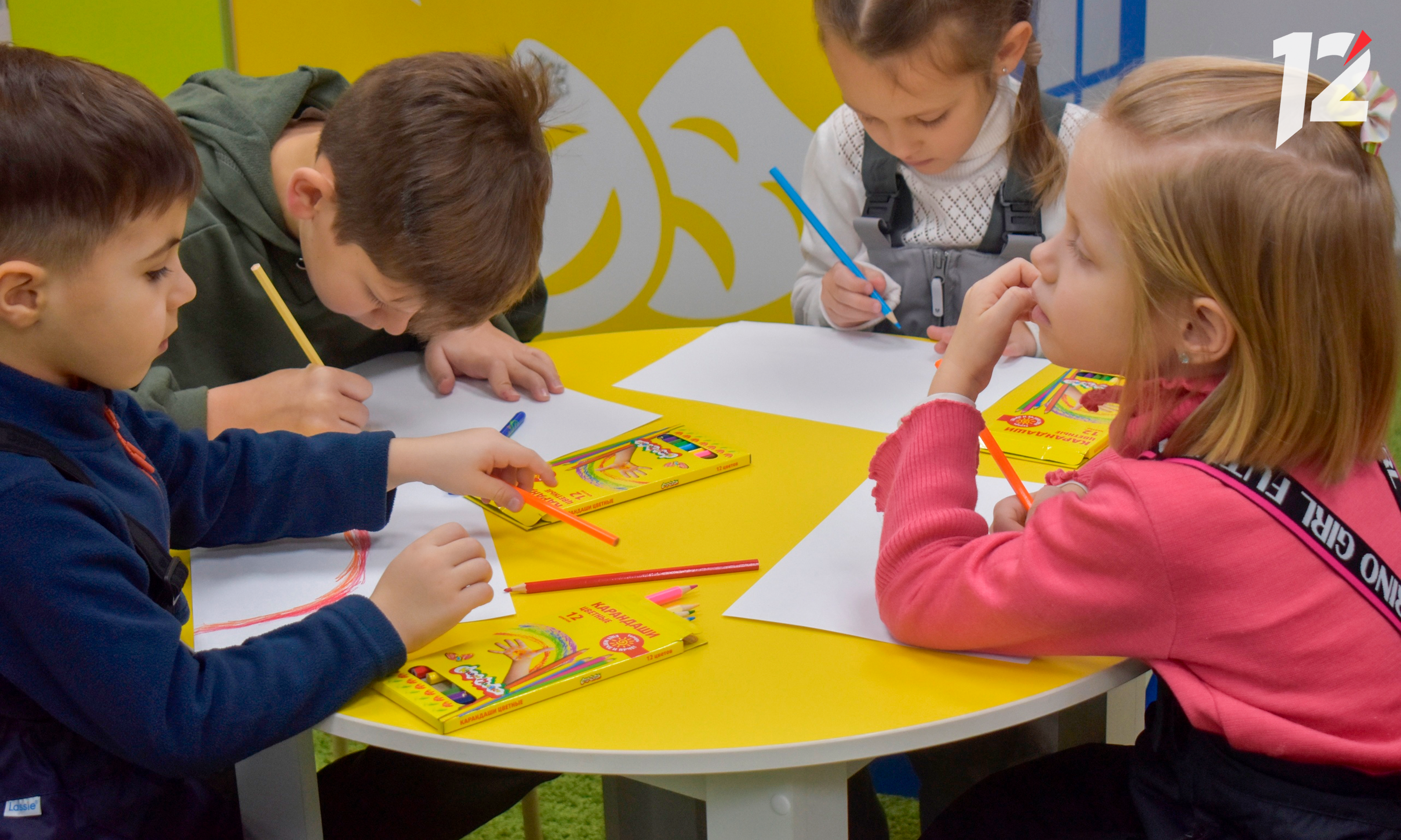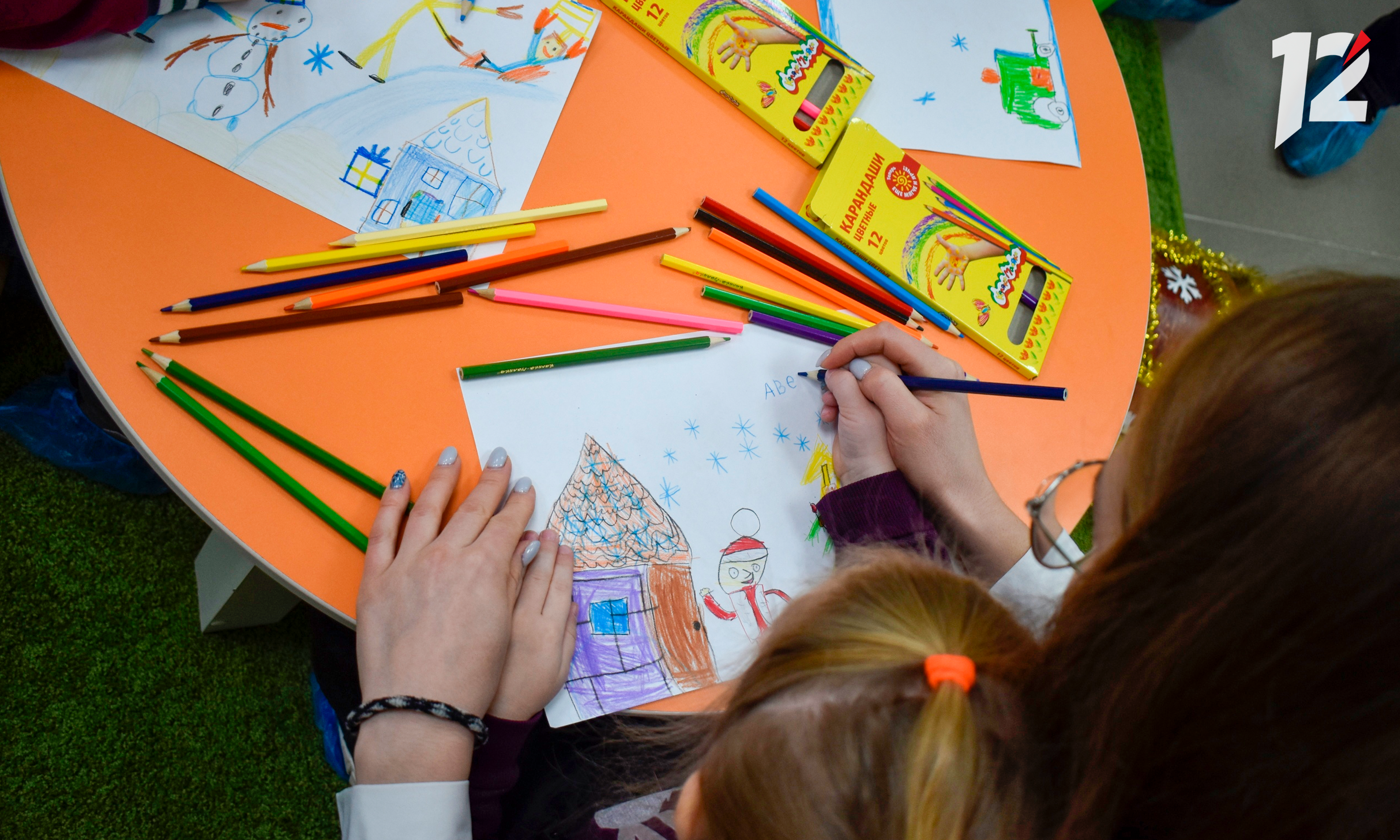 Некоторые из малышей пока что не умеют писать — в школу им только через несколько лет. На помощь приходят цветные карандаши. Рисуют дети снежинки, оленей и самого Дедушку Мороза.