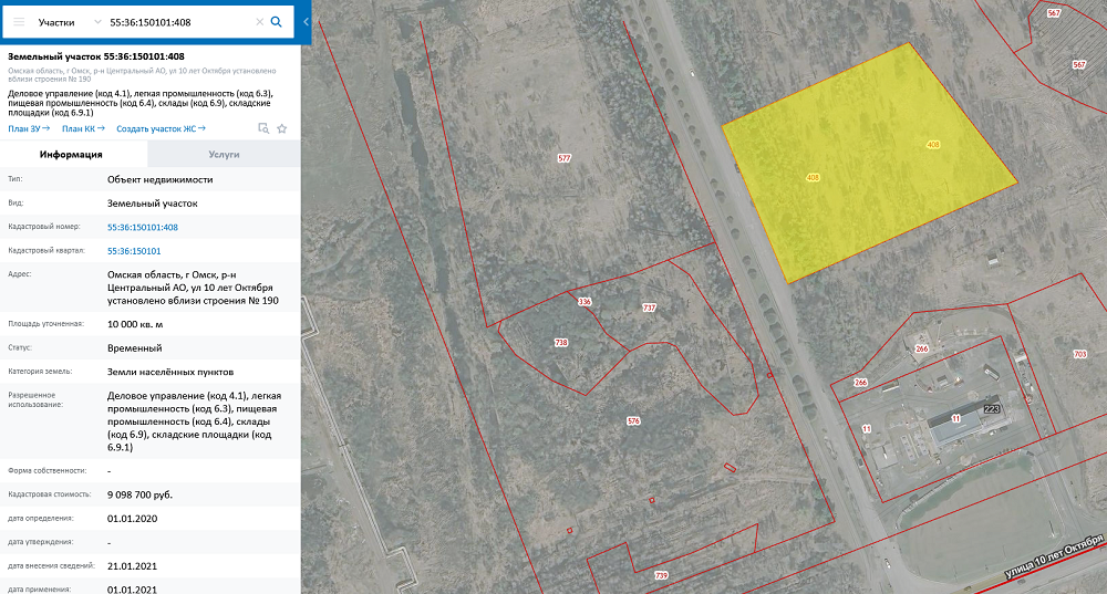 Рядом находится ещё один земельный участок площадью 10 тысяч «квадратов» (кадастровый номер — 55:36:150101:408). Правда, на этой территории можно построить объект делового управления или склад. Победитель торгов сможет арендовать землю на 5 лет и 6 месяцев.