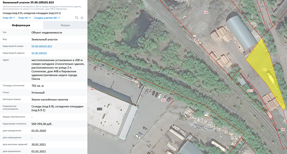 В Кировском округе под строительство склада определены два участка. Первый с кадастровым номером 55:36:100101:813, площадью 702 квадратных метров находится рядом с улицей 2-й Солнечной, 44.