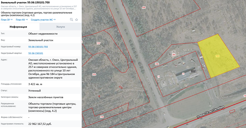 Первый участок с кадастровым номером 55:36:150101:703 расположен в Центральном округе вблизи улицы 10 лет Октября. Территория предназначена для строительства торгового центра или торгово-развлекательного комплекса, площадь участка составляет 3 422 квадратных метра. С победителем аукциона заключат договор на срок 5 лет 6 месяцев.