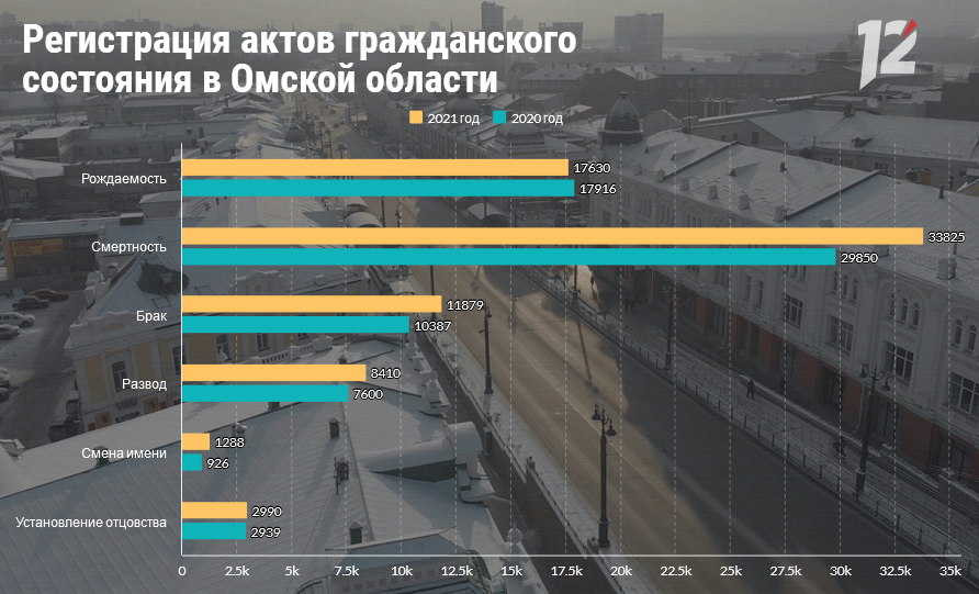 Зарегистрировали в 2021 году 11 879 браков, разводов — 8 410. Годом ранее было 10 387 и 7 600 случаев соответственно. Решили сменить имя 1 288 омичей, а выяснять отцовство потребовалось 2 990 раз.