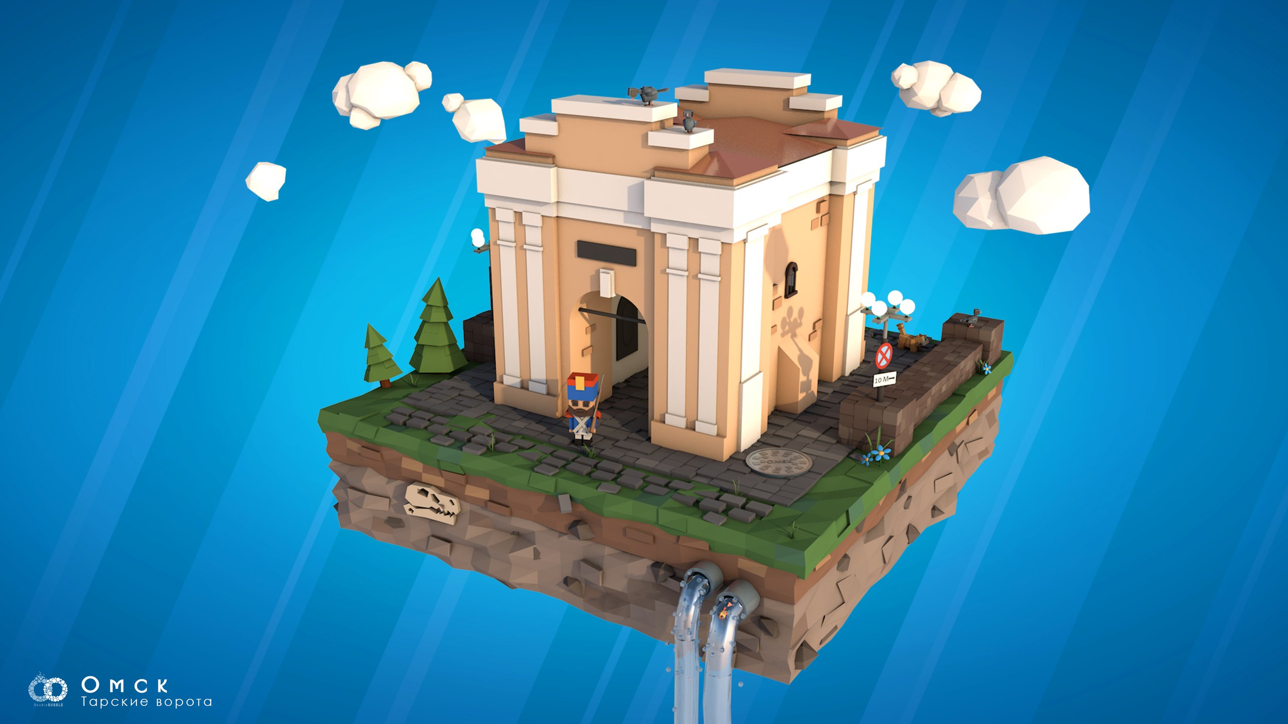 Графические работы в стиле Low Poly опубликовал городской фотограф Александр Калашников в соцсетях. Среди них знаковые места Омска: пивзавод «Волочаевский» на одноимённой улице, из-под которого внезапно вырывается поезд метрополитена, пожарная каланча у Главпочтамта, в толще земли под которой спрятан клад, и Тарские ворота, где также можно найти кое-что нетипичное — череп динозавра и золотую рыбку.