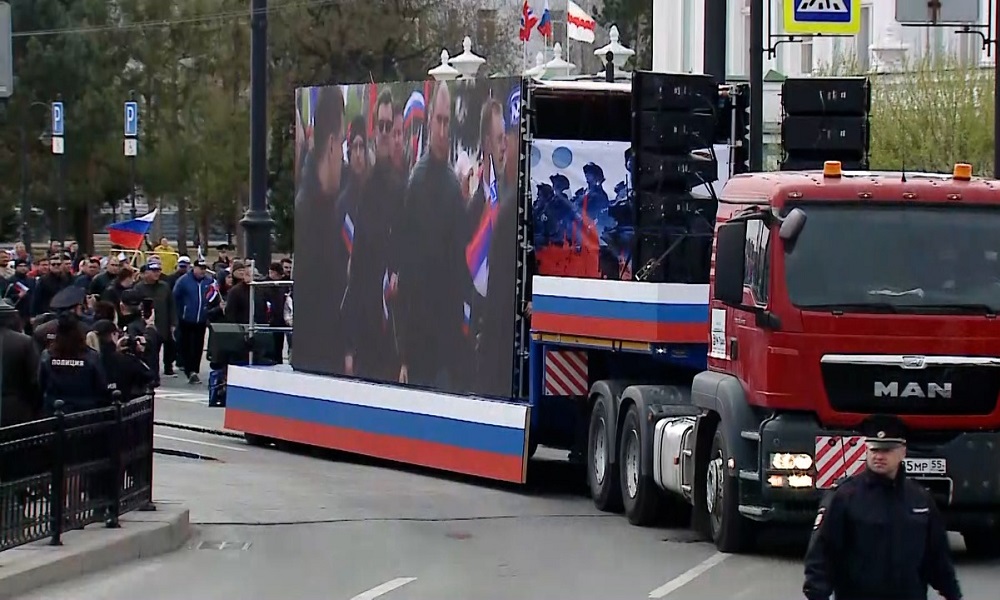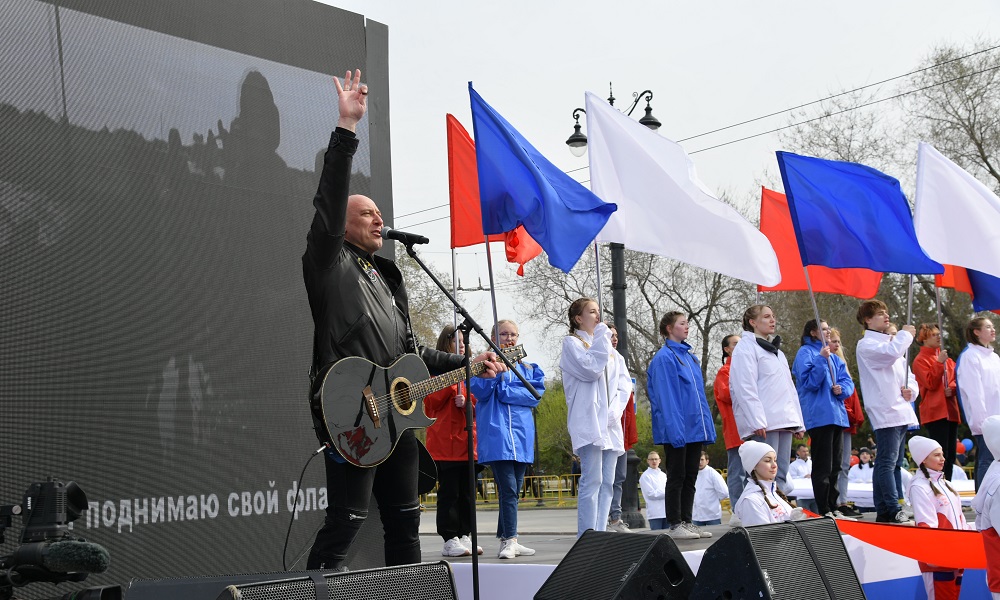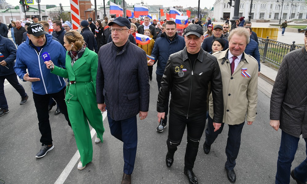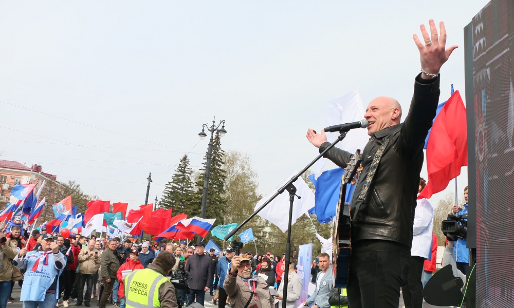 По ходу шествия две группы работали в самой колонне и общались с губернатором Александром Бурковым и заслуженным артистом России Денисом Майдановым, который вместе с омичами исполнял свои песни.