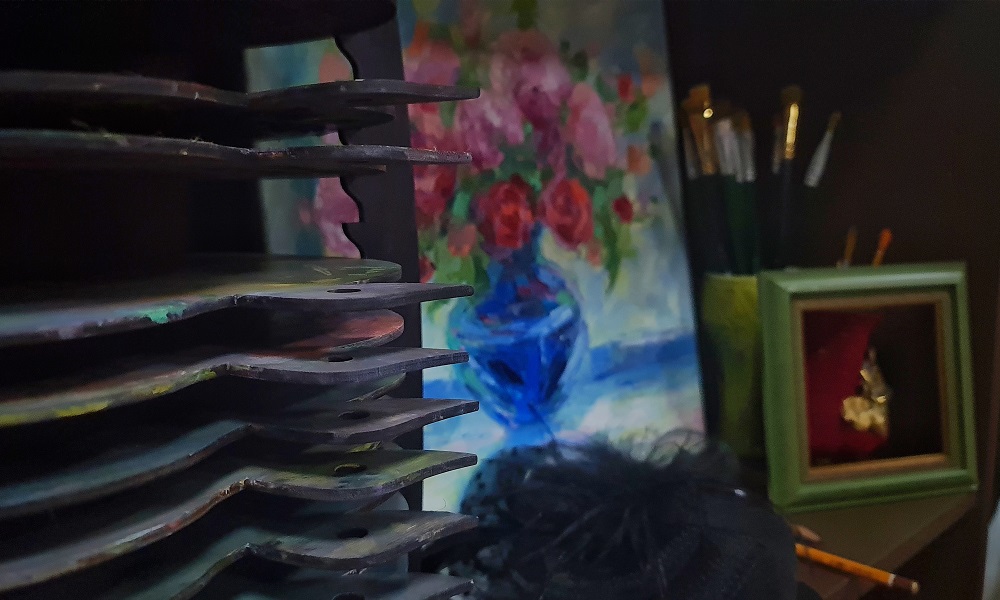 Арт-клуб находится в небольшом помещении с множеством интересных деталей — печатная машинка, пустые тюбики краски, изящные чайные пары, палитры, книги и винтажные украшения.