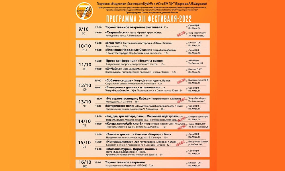 Отметим, что Неделя экспериментального театра проходит уже в двенадцатый раз. Проект реализуется на средства гранта, выделенного омским правительством при поддержке Союза театральных деятелей России.