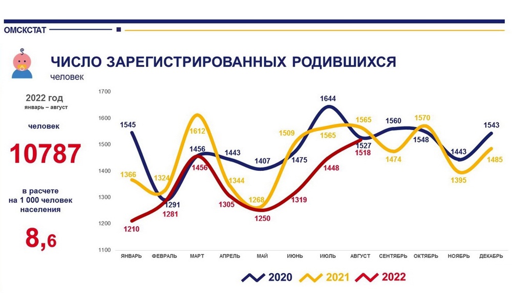Омскстат опубликовал статистику естественного движения населения Омской области за 8 месяцев 2022 года. Согласно приведённым данным, с января по август в регионе родились 10787 детей. Пик рождаемости, или «бэби-бум», пришёлся на август — в этом месяце на свет появились 1518 детей. Минимальный показатель рождаемости зафиксировали в январе. В первом месяце года родились 1210 детей.