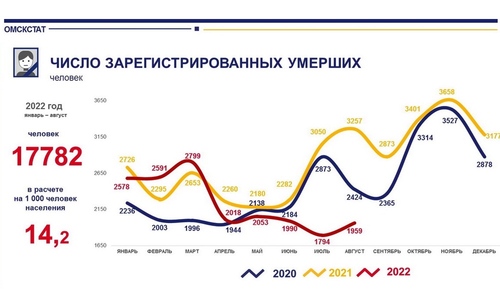 Умерли в Омской области за 8 месяцев 17782 человека. Если сравнивать статистические данные в начале года и в середине, то можно заметить, что в период с января по март смертность в регионе была гораздо выше, чем с апреля по август. В первые 3 месяца количество умерших составляло от 2578 до 2799 человек в месяц. В апреле, мае, июне и августе смертность была на уровне 2 тысяч человек, а в июле опустилась до 1794 человек.