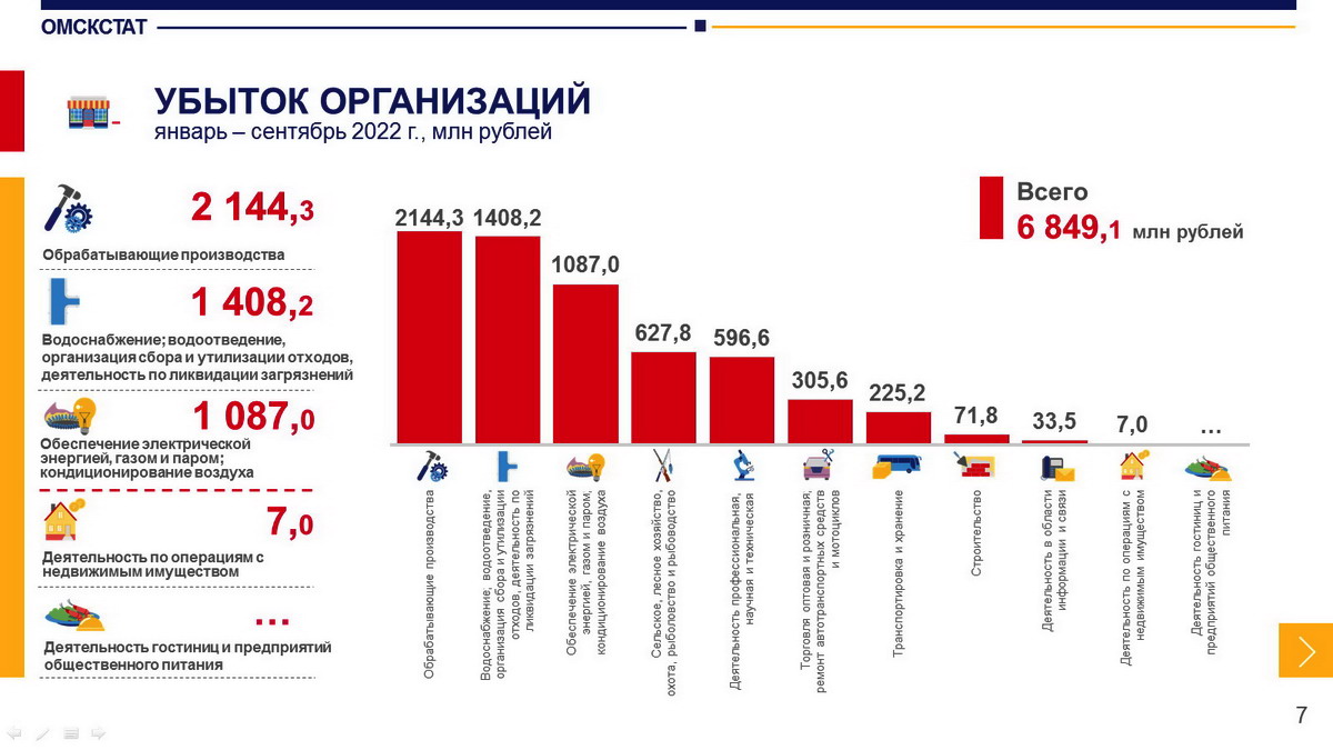 Ещё 148 организаций в Омской области работают в убыток. Убытки по сравнению с аналогичным периодом в прошлом году увеличились на 1,3% и составили 6,8 млрд рублей.