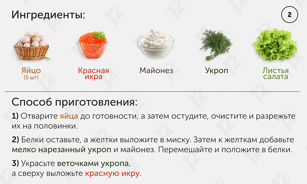 В основе следующего рецепта — куриное яйцо. Вам понадобятся вот такие ингредиенты: