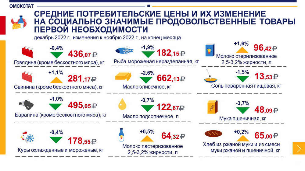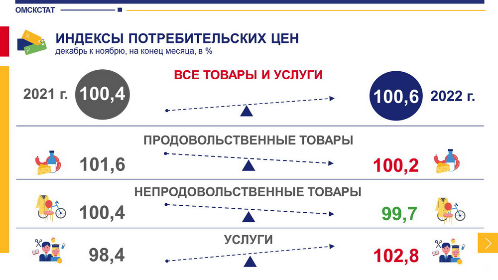 В среднем за 2022 год в Омской области цены и тарифы на товары и услуги выросли на 10,9%, а на продовольственные и непродовольственные товары — на 10,1% и 9,1% соответственно.