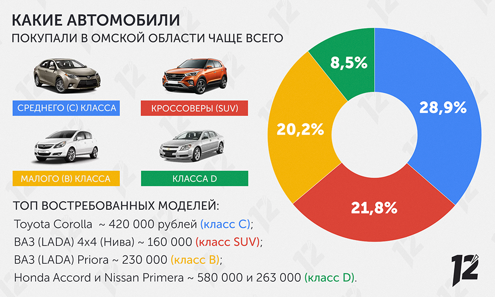 Согласно исследованию сервиса «Авито. Авто», в 2022 году чаще всего омичи покупали машины среднего класса (28,9%). Жителей региона также интересовали кроссоверы (21,8%) и автомобили малого класса (20,2%). Большие семейные автомобили в Омской области не так востребованы. Их доля продаж составила всего 8,5%.