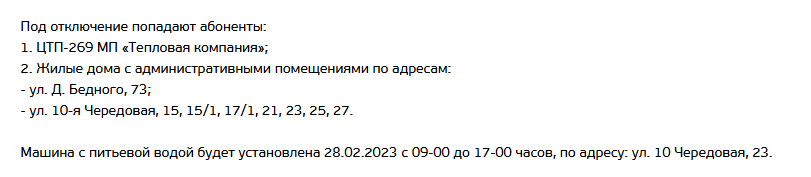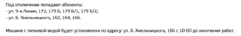 1 марта с 10 до 22 часов будут проводиться ремонтные работы на водопроводе, проложенном по 9-й Линии. Причина — переврезка водопровода на 9-й Линии, 172.