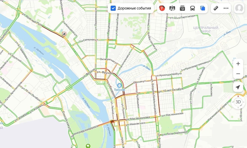 Согласно сервису «Яндекс.Пробки» сегодня вечером, 10 марта, пробки в Омске достигли 10 баллов. Сильнее всего движение было затруднено в центре города и Левобережье. Заторы наблюдались на Ленинградском и Фрунзенском мостах, а также улицах 70 лет Октября, Красный путь и Бульвар Архитекторов.Отметим, что на данный момент пробки в городе достигают 7 баллов.