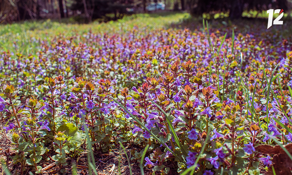 Дорожки между деревьями устланы ковром из так называемой собачьей мяты, или травы будры плющевидной. Её цветки маленькие, но очень яркие. Кстати, это растение применяют для ароматизации и приготовления тонизирующих напитков, а в медицине используют при воспалении лёгких, астме, заболеваниях печени, жёлчного пузыря и щитовидной железы.