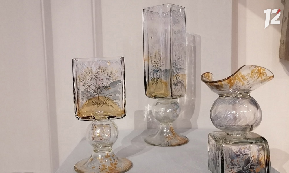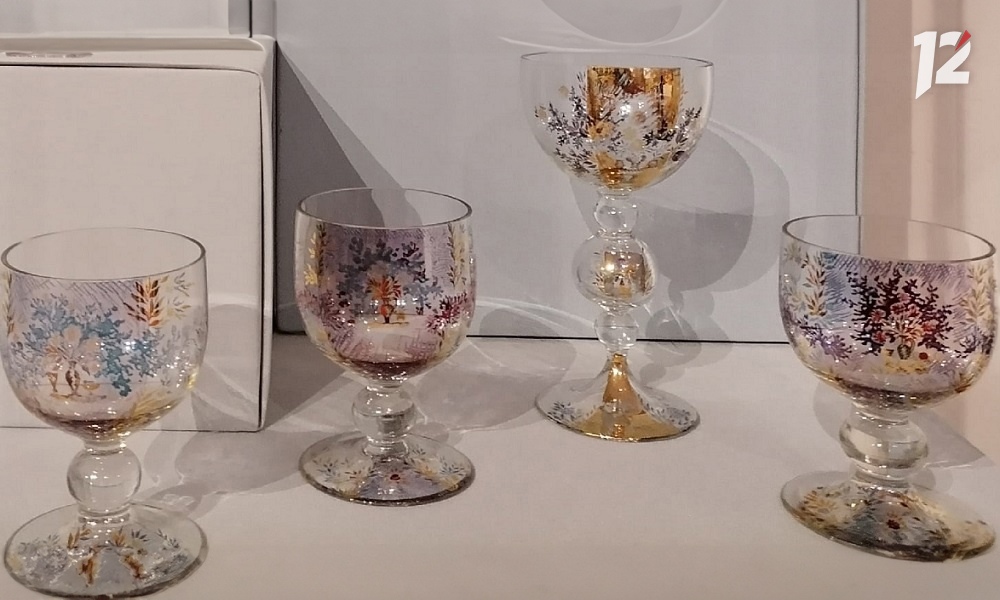 А в соседней витрине ещё один пример скрупулёзности и внимания к деталям — расписанные вручную авторские бокалы Евгении Вихровой.